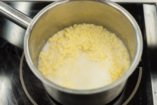 Kaszę jaglaną przepłucz zagotowaną wodą, a następnie przełóż do garnka z mlekiem i gotuj na małym ogniu (pod przykryciem) do miękkości.