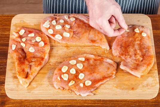 Ząbki czosnku pokrój w plasterki i rozłóż na filetach.