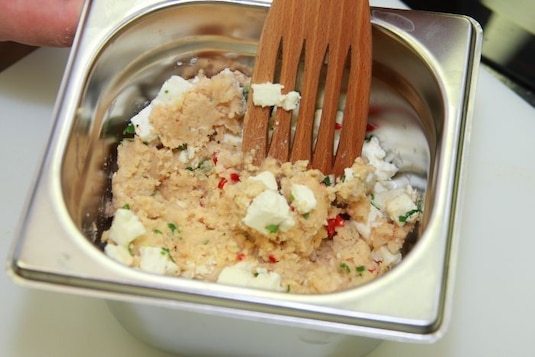 Dodaj do masy jajka, dopraw pieprzem oraz solą (jeśli uznasz to za konieczne) i dokładnie wymieszaj. Pokrój fetę w niedużą kostkę i dodaj do masy fasolowej. Ponownie wymieszaj.