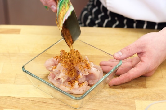 Na głębokiej patelni rozgrzej olej i usmaż pokrojoną w paski pierś z kurczaka posypaną obficie przyprawą Knorr.