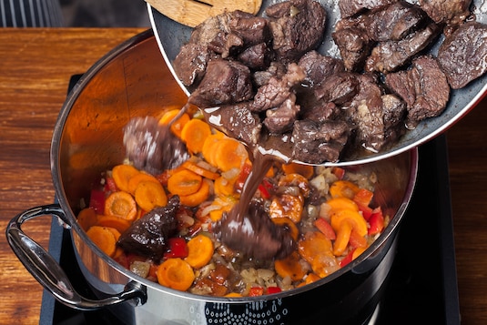 Dodaj wodę i mięso miękkie, zagotuj.