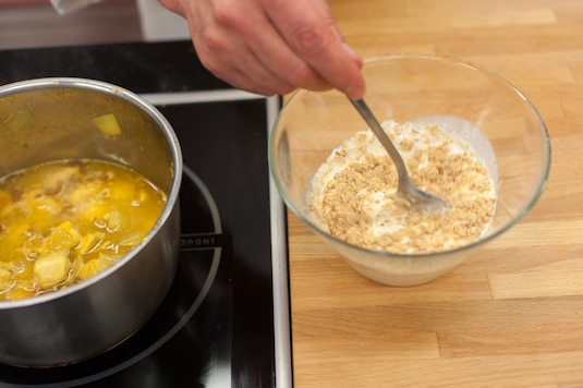 Mięso pokrój w dużą kostkę o boku 2 cm i zamarynuj w połowie oleju i curry. Dokładnie wymieszaj i odstaw na 20 minut.