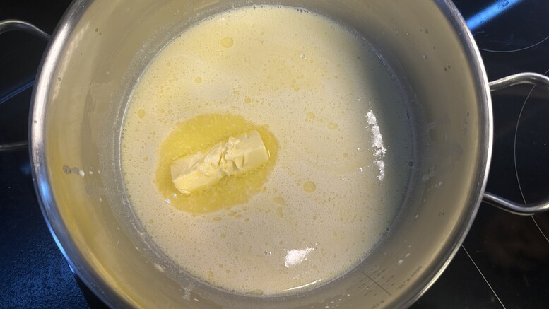W drugim garnku wlej mleko, dodaj fix Mac'n Cheese Knorr i wymieszaj. Następnie dodaj masło i całość ponownie wymieszaj do połączenia się składników.