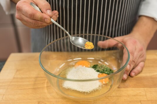 Jajka roztrzep, dodaj posiekaną natkę pietruszki i otręby. Dopraw do smaku przyprawą uniwersalną Knorr i pieprzem. Następnie wymieszaj.