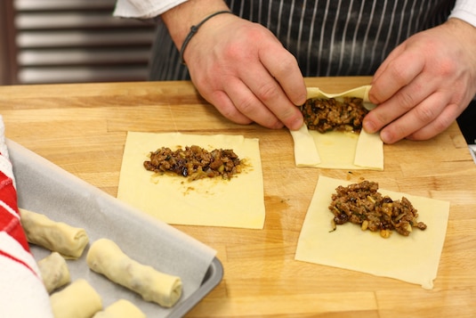 Ciasto rozwałkowuj możliwie jak najcieniej na stolnicy oprószonej obficie mąką. Z płatu wykrawaj kwadraty 15 × 15 cm. Każdy smaruj z wierzchu jajkiem i nakładaj po 1 łyżce farszu. Brzegi ciasta zawijaj do środka, a następnie roluj, formując długie na około 10 cm paluchy. Gotowe roladki układaj na pergaminie, cały czas trzymając je pod przykryciem.