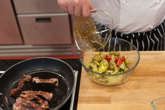 Boczek usmaż na suchej patelni, żeby był chrupiący.