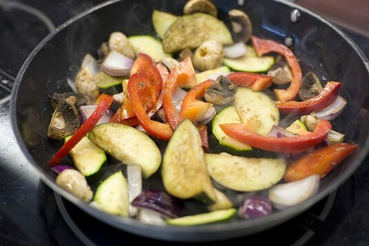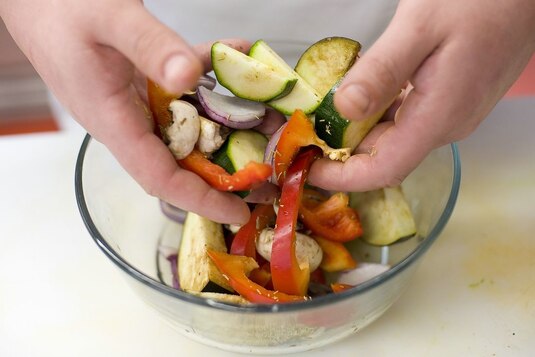 Warzywa umyj, oczyść i pokrój w półplastry. Pieczarki natomiast w ćwiartki. Wszystkie warzywa wymieszaj razem.