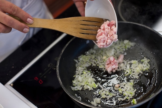Słoninę i cebulę pokrój w kostkę, podsmaż, podziel na dwie części.