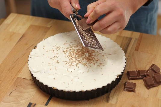 Wierzch bananowej tarty obsypcie startą czekoladą. Możecie także wykorzystać orzechy, które wcześniej należy posiekać.