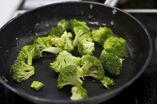 Brokuły podziel na różyczki i smaż przez 2 minuty.