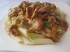 Dodajemy krewetki oraz grzyby i makaron. Dodajemy posiekany w słupki szczypiorek, kolendrę oraz sos sojowy.