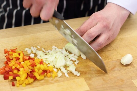Jedną paprykę pokrój w drobną kostkę. Cebulę i czosnek posiekaj. Podsmaż wszystko na patelni.