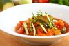 Cukinie obieramy ,kroimy w grubą kostkę, z papryki wybieramy pestki, kroimy w gruba kostkę, pomidory sparzamy, kroimy w kostkę, cebule obieramy, kroimy w grubą kostkę, kiełbasę kroimy wzdłuż i na małe kawałki.