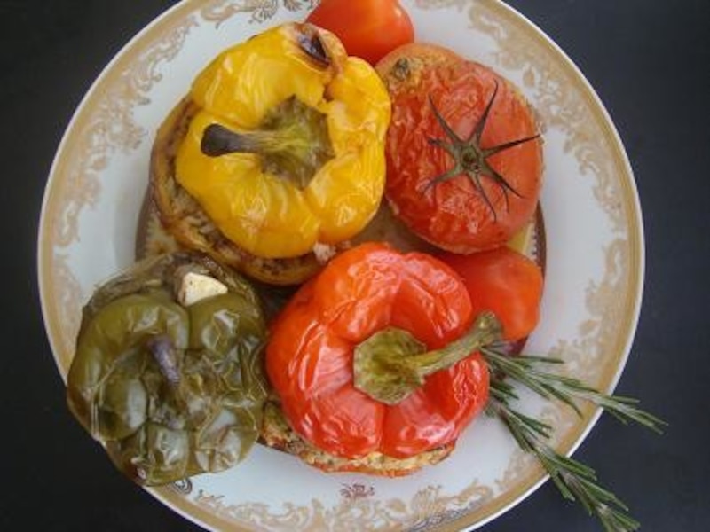 Cukinię umyc i pokroic w kostkę.Pieczarki umyc i pokroic w plasterki.Ryż wymieszac z cukinią,pieczarkami,jednym jajkiem.Przyprawic,dodac fetę i nadziac pomidora oraz papryki,przykryc każde warzywo odciętym kapeluszem.