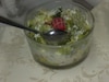 Miks sałat wsypujemy do salaterki. Ser żółty kroimy w drobną kostkę, cebulę w piórka. Wszystko wrzucamy do sałaty.