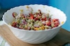 Kapustę pokrój w paski, pomidory, cebulę i ogórki w kostkę, a kukurydzę odcedź.