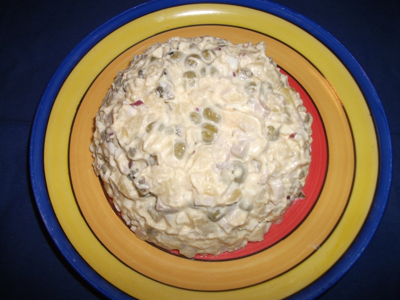 Ziemniaki obieramy i gotujemy, jaja gotujemy na twardo. Wszystkie składniki poza groszkiem kroimy w kostkę, mieszamy. Sos przygotowujemy wg uznania "na oko" z majonezu (można go zmieszać lub zastąpić jogurtem), musztardy, doprawiamy solą i pieprzem. Sałatkę polewamy sosem przygotowanym z jogurtu i sosu koperkowo - ziołowego Knorr, mieszamy i odstawiamy w chłodne miejsce, by składniki się przegryzły.