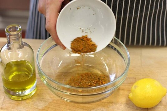 Przygotuj sos sałatkowy – zawartość opakowania Knorr połącz w miseczce z oliwą (3 łyżki) i sokiem z cytryny. Wymieszaj.