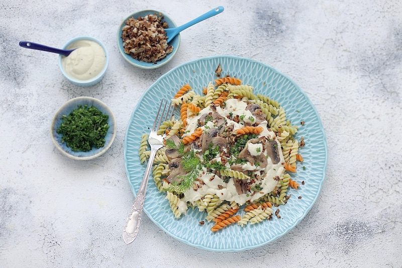 Świderki w sosie kalafiorowo orzechowym z posypką